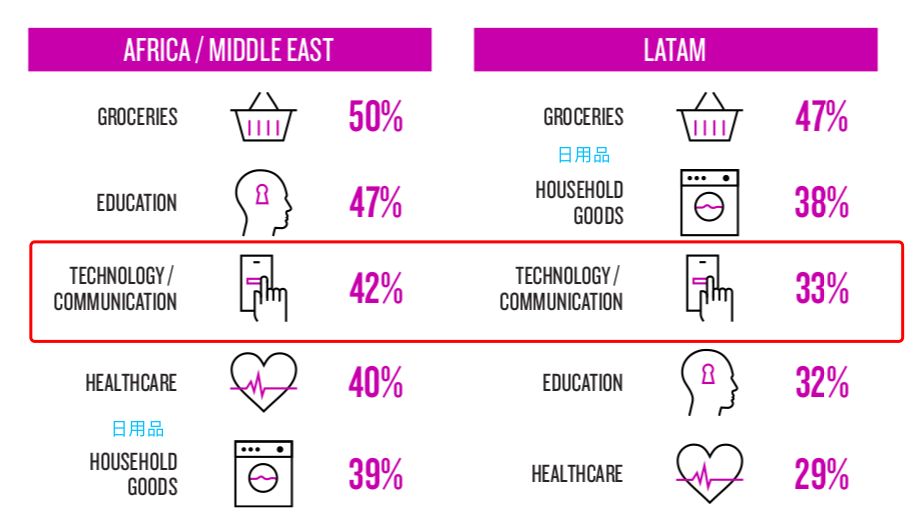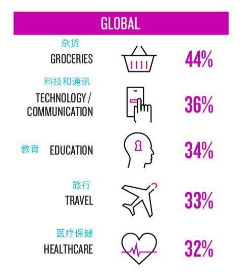 杂货之外,近五年来消费者花费最多的品类是科技和通讯(38%)、教育(34%)、旅游(33%)和医疗保健(32%)。科技和通讯方面的支出上涨是全球范围内的普遍现象,而教育、旅游和医疗保健等支出呈现区域性。