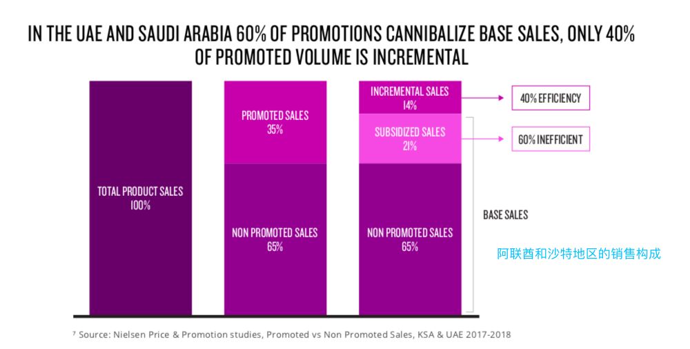 尼尔森数据指出,在2017-2018年,打折促销带来了阿联酋和沙特阿拉伯60%的基础销量,只有40%的需求是增量销售。这不仅反应出该地消费者对商品价格的敏感度,同时也导致消费者习惯于在高频率打折的环境下购物。