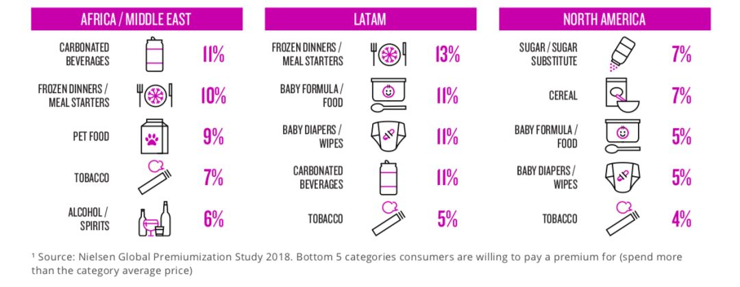 通常来说消费者是极具成本意识的,喜欢追寻低价商品,但也有一些品类消费者愿意支付溢价。全球范围来看,消费者愿意支付高价的品类包括:消费电子产品(42%),服装/鞋子(40%),化妆品(31%)、乳制品(30%)和肉类/海产食品(29%)。