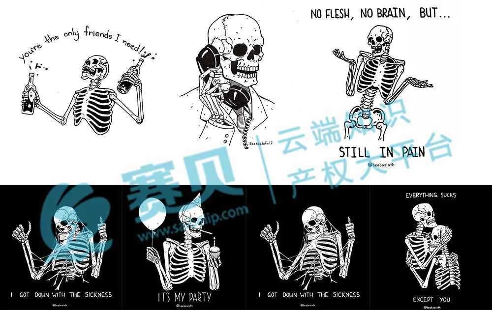 案件涉及多项美国版权,涵盖以骷髅为核心元素的系列设计(如《I GOT DOWN WITH THE SICKNESS》《NOTHING TO LOSE》《EVERYTHING SUCKS EXCEPT YOU》等 ),受版权法保护 。其风格延续 “虚空派(vanitas)” 艺术内核,以简约线条勾勒骷髅形态,融入幽默、叛逆文字(像 “I GOT DOWN WITH THE SICKNESS”“YOU'RE THE ONLY FRIENDS I NEED” ),通过骷髅抽烟、举气球、拥抱等生活化场景,借死亡符号传递对生命、孤独、情绪的思考,兼具暗黑美学与人文温度。