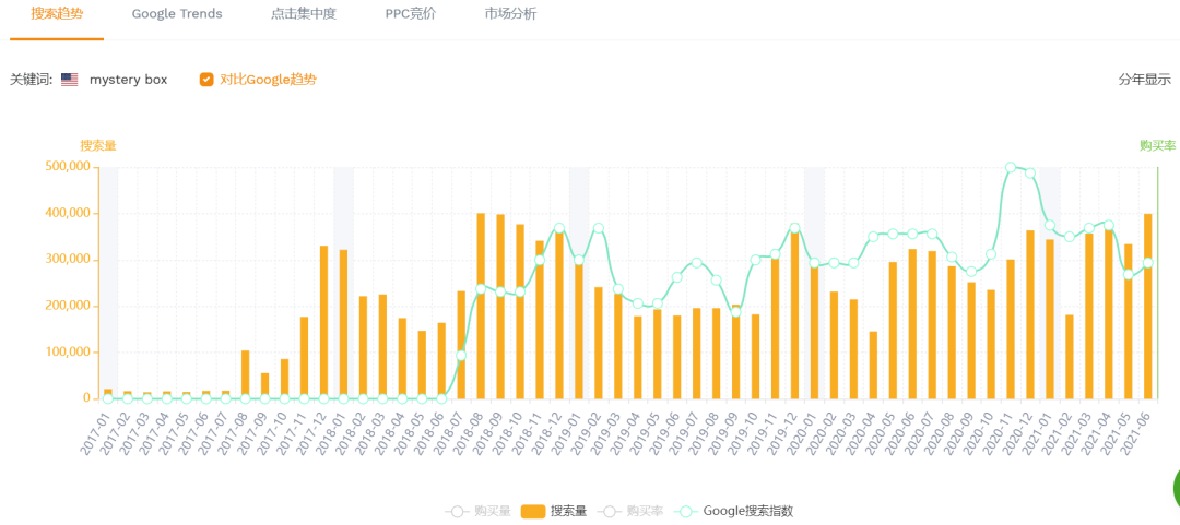 而且关键词:mystery box在亚马逊站内的搜索量一直很高。