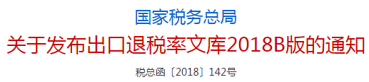 官方公告:国家税务总局4月11日发布的《关于发布出口退税率文库2018B版的通知》 地址:http://www.chinatax.gov.cn/n810341/n810755/c3397761/content.html