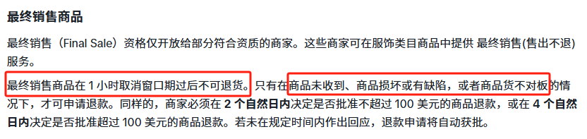 只要设置为Final Sale,消费者只能在商品未收到、损坏或与描述严重不符的情况下,申请退款退货,且退货窗口期仅 1 小时。这等于把“用完就退”的空间彻底堵上,专门针对季节性强、定制化、限量款等适合“一锤子买卖”的场景。