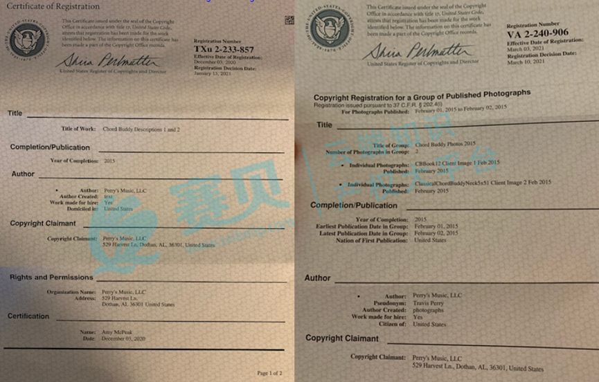 本案还涉及两个美国注册版权,注册号为 TXu 2-233-857 和 VA2-240-906 的版权,涉及 “Chord Buddy Descriptions 1 and 2” 以及 2015 年发布的一组照片等作品,版权图片尚未公布。