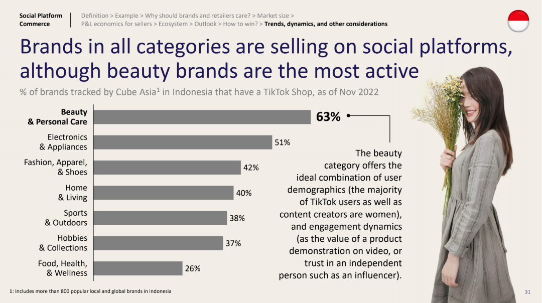 根据 Cube Asia 发布的“2022 年东南亚社交商务”首份报告显示,今年,东南亚社交商务的总价值为 420 亿美元,直播电商为 120 亿美元,印尼作为最大的市场,直播销售额有望达到 50 亿美元。 据 Cube Asia 首席执行官 Sarabjit Singh 称, 东南亚的社交媒体参与度是世界上最高的。该地区多达 90% 的互联网用户已经拥有 Facebook、Instagram、WhatsApp、TikTok 或 LINE 帐户。 报告称,印度尼西亚和泰国多达 55% 的互联网用户会在这些平台购物,平均每年分别花费 100 美元/人和 180 美元/人。 虽然 Facebook 和 Instagram 是社交商务的发起者,但 TikTok 已经成为后起之秀。 特别是在美妆产品方面,印尼受访的 800 个美妆品牌中,多达 44% 表示已经开设 TikTok Shop。 同时,直播购物正在成为东南亚快速增长的趋势。到 2022 年,其增长可能达到 10 倍,总价值 130 亿美元。 在过去的一年中,至少有 44% 的互联网用户尝试过直播购物。 印尼是东南亚最大的直播购物市场,2022 年的 GMV 接近 50 亿美元。通常,直播购物主要出现在 Facebook 和 Instagram 上。不过,TikTok 目前在直播购物中占据很大份额。