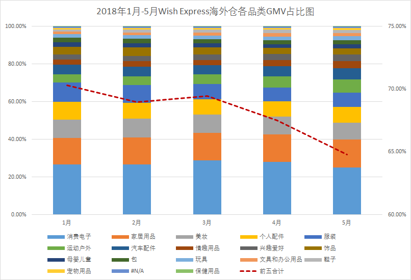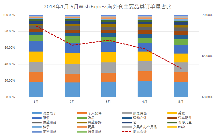 订单量前五的品类,合计订单量占比降至不足65%,为今年以来的最低,也反映出Wish Express海外仓品类销量的逐渐多元化;