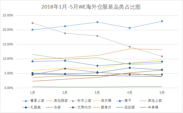 连衣裙、礼服类、泳装、半身裙等春夏季节特色明显的服装也保持着占比上涨的趋势;