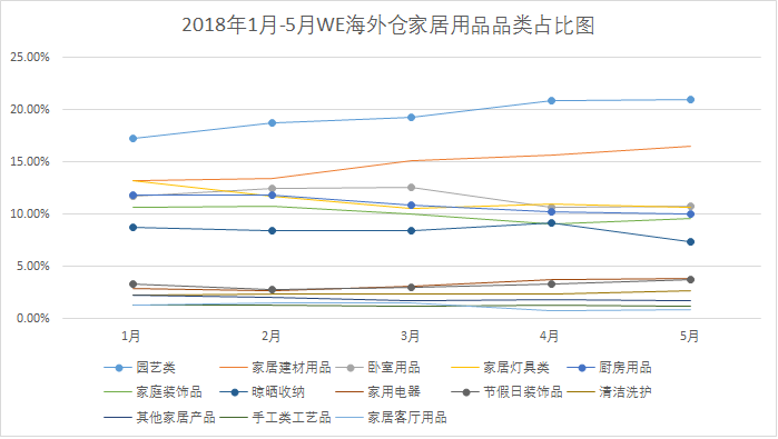 园艺类一直是家居用品品类中的主要产品,随着夏季的到来,GMV占比继续攀升,已经达到了家居用品总GMV的20%以上;