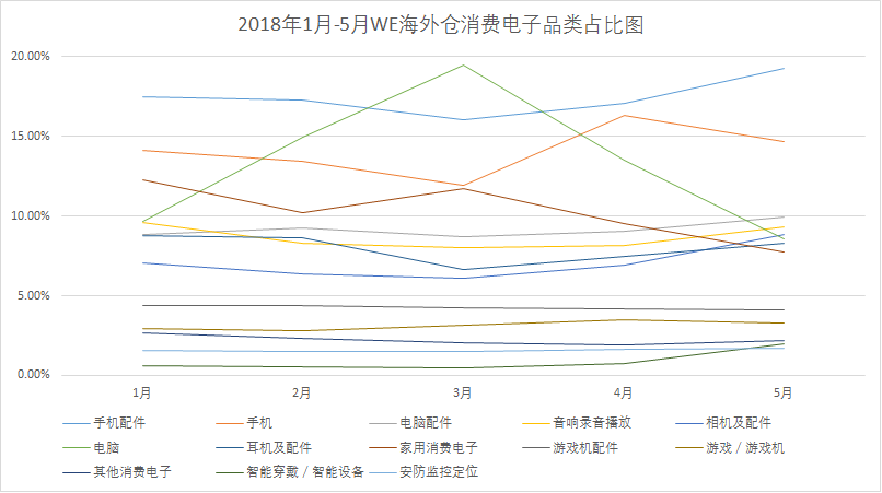 纵观2018年1月-5月的WE海外仓消费电子品类的GMV变化,可以将消费电子类下的子品类分为三档:
