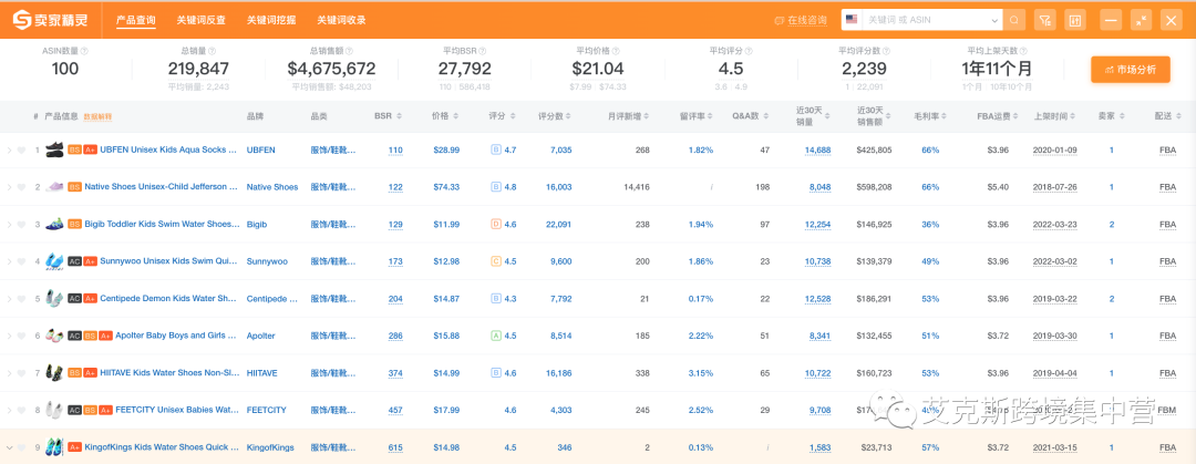 我们通过卖家精灵选品工具将top100的产品全部下载下来,然后在里面确定你的产品的排名。我以鞋子这款产品为例子,加入我的产品的排名是第20,如果我们想要保证我们的20名不下降,那么我们必须要保证我们的单量必须要和前几天的出单量持平或者高出前几天的单量。