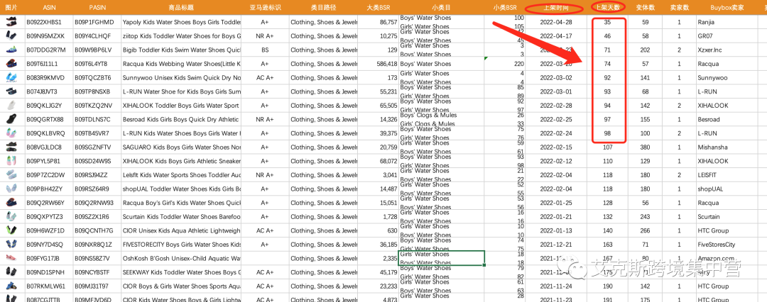 我们通过卖家精灵插件,将产品上架半年的TOP100竞争对手整理出来,因为这是半年之内就做到top100的产品,说明他们的选品是市场上很受欢迎的,我们可以看到第3名仅仅上架了71天;第4名上架了92天,那么他们的运营技巧一定有值得我们学习的地方!