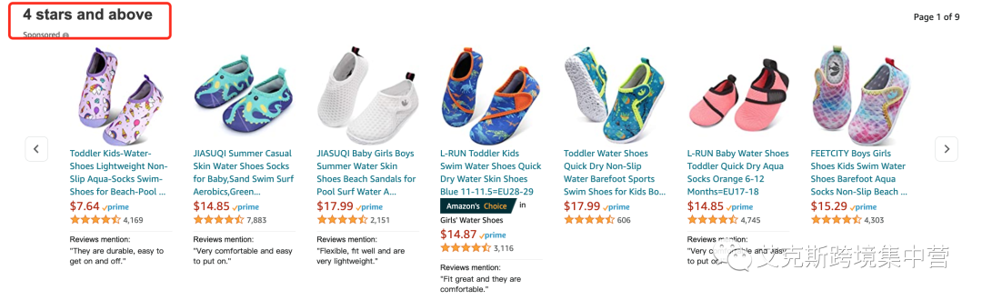 以这个第四名为例子,这款产品在关键词:kids barefoot water shoes下获得了Amazon Choice标识。想要获取Amazon Choice标识,最简单的方法就是在你的出单最多的关键词中,选择一个关键词主打,稳定增加这个关键词的销量,很快这个关键词就可以获得Amazon Choice的标识了。