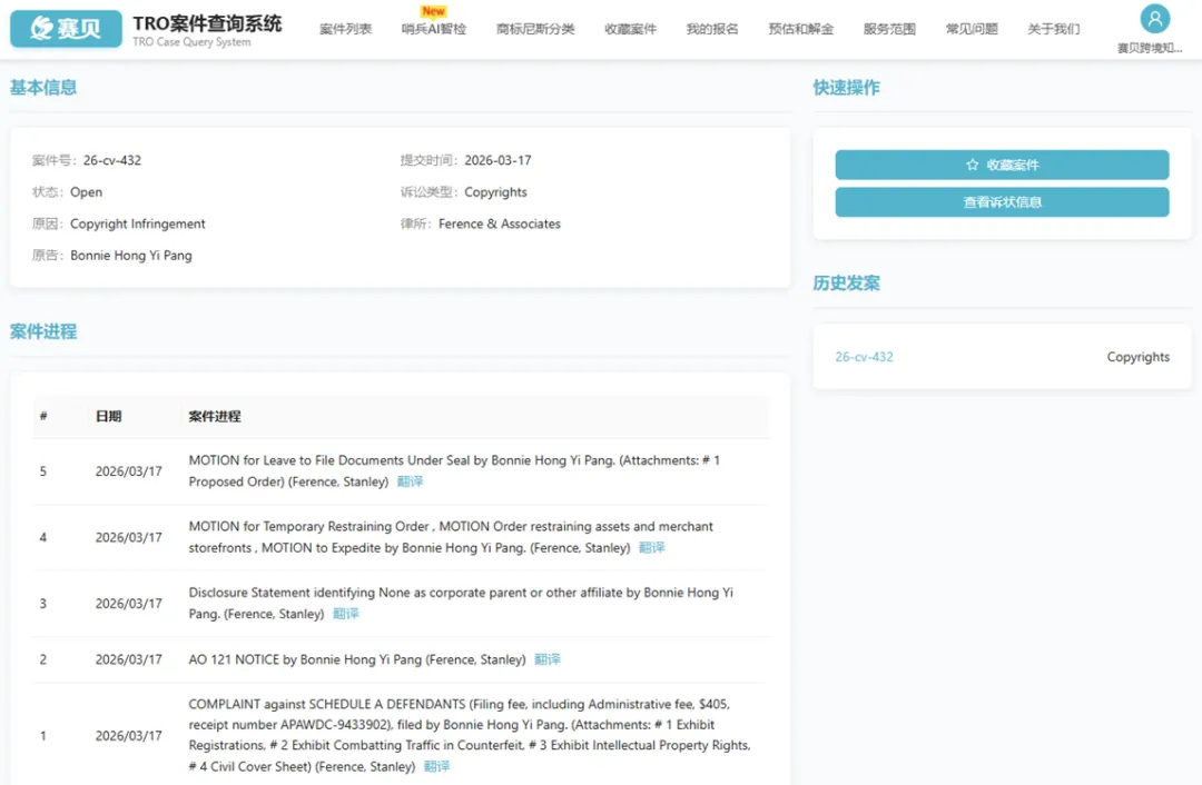 目前案件还未有重大进展,卖家可以在赛贝TRO案件查询系统免费下载诉状和跟进案件最新进度!(公众号菜单及赛贝知识产权官网均有入口)