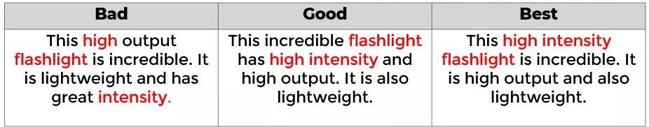 虽然商品标题中的关键词对相关性认定最重要,但是商品描述中的关键词密度也是同等重要的。同时,还需要注意关键词的紧密程度,这条规则让我们用关键词high intensity flashlight来进行说明:
