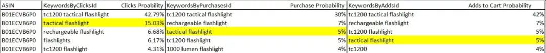 上面的图片来源于一份解密的亚马逊内部排名报告。从这份报告上,我们可以看到亚马逊在每个关键词上精确跟踪买家点击Listing的时间百分比、继续添加到购物车以及实际购买的比例。