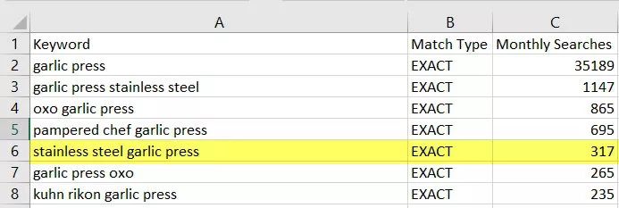 例如从上表数据中我们可以了解到stainless steel garlic press可能是一款利基产品,而且月搜索量具有一定潜力。