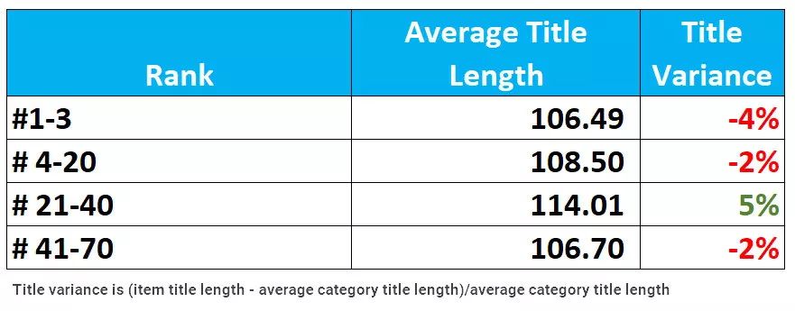 从下图的一份亚马逊市场研究报告中,我们可以看到那些排名更高的商品反而拥有更精炼的标题。