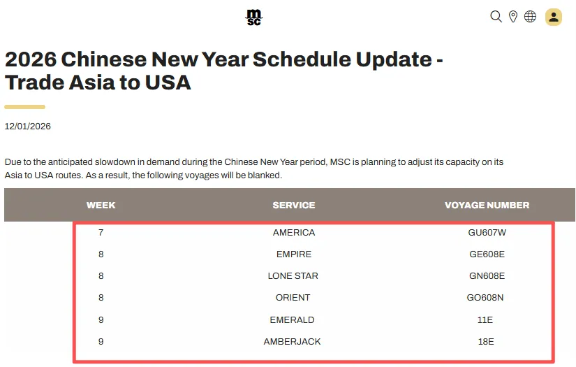 12日,MSC发布通知,鉴于春节期间亚洲至美国航线需求放缓,MSC计划调整运力,以下航次将被取消: