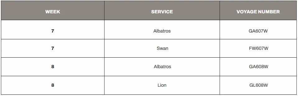 此前,双子星联盟(Gemini)旗下的马士基和赫伯罗特也已宣布,将为春节期间安排大量空航。由于2月17日是中国农历新年,这一假期将导致Gemini网络中有16个航次被取消,这些被取消的航次涉及跨太平洋、欧洲、阿拉伯湾、南美东等多个航线。