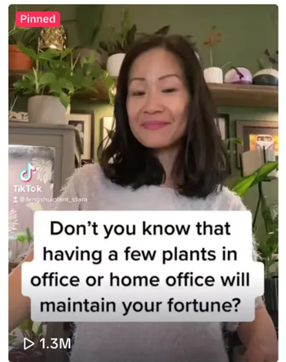 例如,风水与家居设计的融合是其中一大热门趋势。一位华裔TikTok博主Clara,凭借介绍办公室摆放哪些植物能聚财的视频播放量高达 130 万,迅速走红。在她的视频中,将虎尾兰、摇钱树等植物与聚财联系起来,简单直白的表述深受海外用户的喜欢。TikTok上的网友们却尊敬地称呼她为:“The Feng Shui Plant Lady”(风水植物女士)。