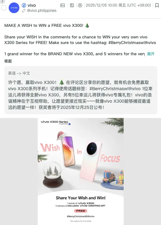 设计鼓励用户分享真实使用体验的 campaigns(如带真实场景照片的评测活动),并提供便捷工具。对真实的用户生成内容进行官方认可与传播,既能获得高质量素材,又能巩固用户社群的真实感。如vivo的新品x300 发售正值圣诞期间,因此vivo将圣诞的许愿习俗与新品的“捕捉最遥远的愿望”的特点结合在一起,邀请用户分享自己的愿望,赢得手机新产品。在出海市场,品牌可结合当地文化中的许愿传统或星空意象发起“全球愿望采集”活动,以本土化的UGC叙事提升情感共鸣与真实连接。
