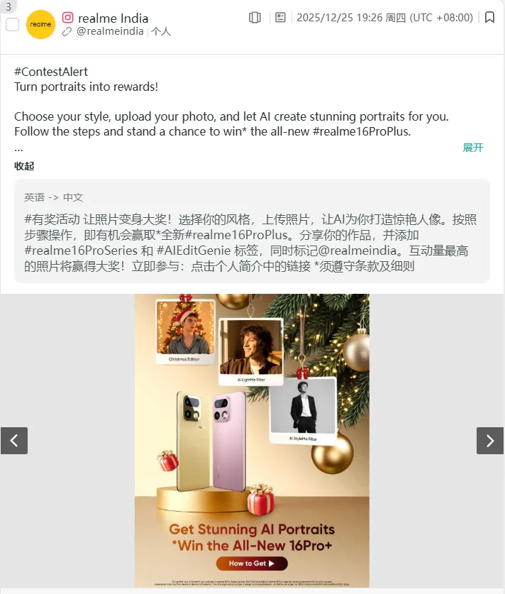 品牌需要明确哪些类型的内容适合使用AI生成,哪些领域必须保持人工创作和真实记录。这种分类管理策略能够帮助品牌在享受AI效率红利的同时,保护品牌信任的核心资产。如 realme 发起“AI为你打造惊艳人像”互动活动,鼓励用户上传照片并由AI生成艺术化人像,快速吸引大量参与和传播;同时,其产品性能测评等内容仍坚持由真实用户出镜,以真实叙事巩固品牌信任。
