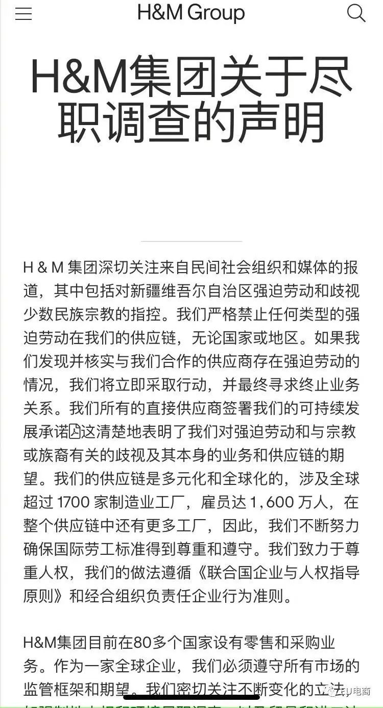 近日,欧洲快时尚品牌H&M集团发布声明,称H&M集团对来自民间社会组织的报告和媒体的报道深表关注,其中包括对新疆维吾尔自治区少数民族“强迫劳动”和“宗教歧视”的指控。声明中,H&M集团表示,不与位于新疆的任何服装制造工厂合作,也不从该地区采购产品/原材料。