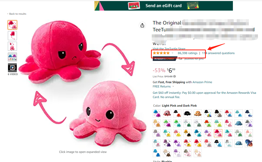 可爱小章鱼火遍全网目前这个章鱼玩偶占据亚马逊多个玩具排行榜单的第二名,在tiktok、ins、脸书上的视频播放量总量也高达几千万。
