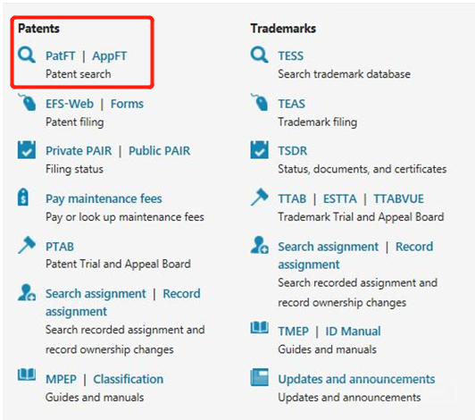 2:然后选择patft ,appft是在申请中的意思,patft这个是已经授权的。一般我们查已经拿到授权的、申请中的专利是没有办法维权的。