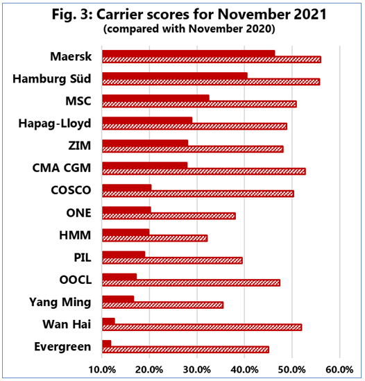 时间表的可靠性没有下降,但仍处于低位。Sea-intelligence报告:2021年11月,时间表可靠性环比下降0.6个百分点至33.6%,8月是33.4%。截止到11月,2021年的平均值为36%,去年的平均值则接近66%。
