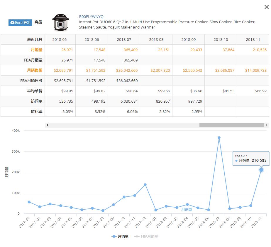 电饭锅品类排名第一的产品,11月份的月销售额是$14089733,1月份的销售额降至 $5439690 , 销售额跌幅是61%,销量曲线也是从1月到8月需求疲软。
