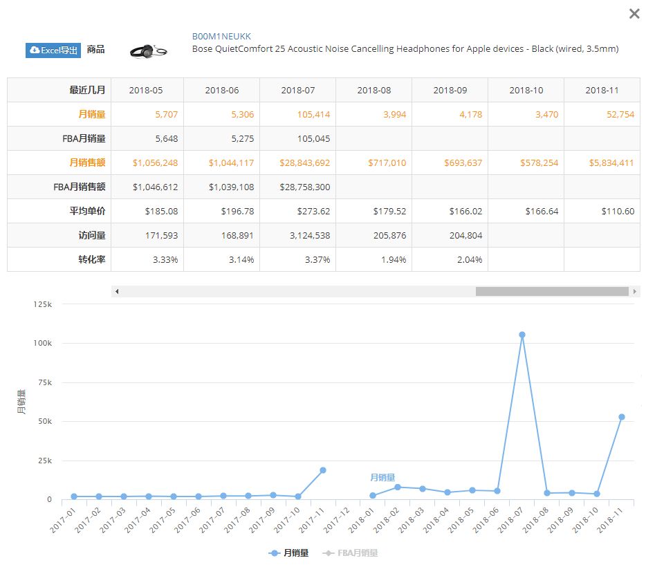 这款耳机产品11月份的销售额为 $5834411, 1月份的销售额降低 $517055 ,跌幅超10倍。