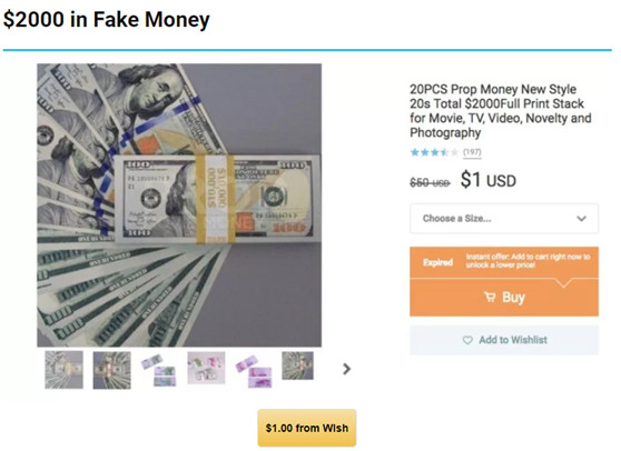 Wish上有各种玩具假钞,有各种版本。有买家评论说,这些钱看起来相当真实,这与上述的金块一样,都是非常棒的恶作剧工具。