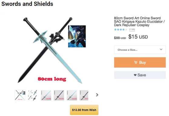 如果你想要购买一些剑装饰房子,或者用于角色扮演,Wish上有许多动画、动漫中的同款玩具刀剑,有的用泡沫制成,有的是铁质的,你可以根据需要选择。