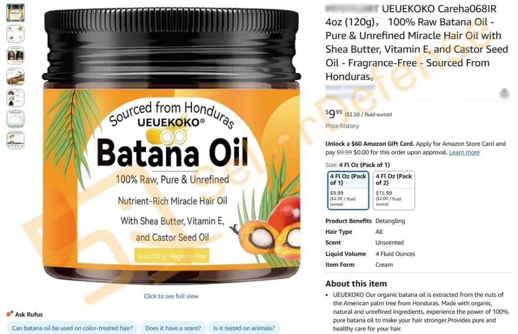 本案涉及商标注册在第三类:日化用品。主要产品是一款“天然巴塔纳护发油”,请相关卖家注意排查避雷!