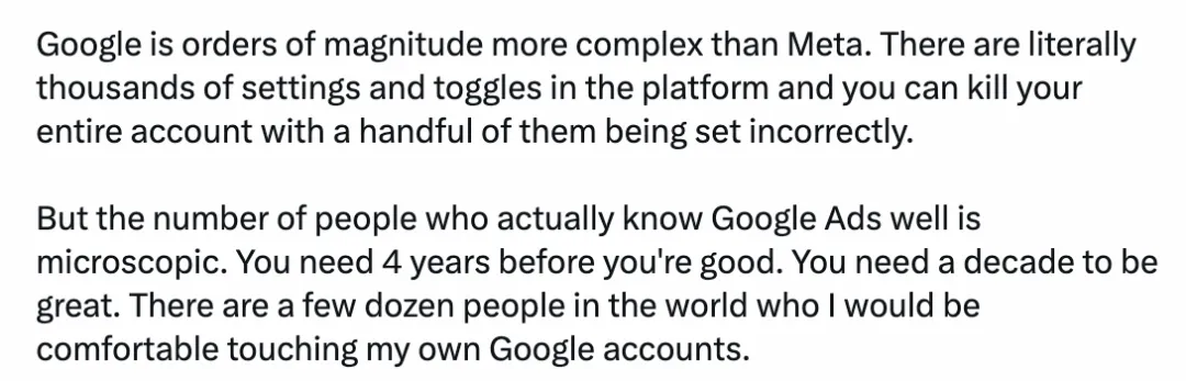 但真正精通 Google Ads 的人数是微乎其微的,你需要 4 年才能变得熟练,你需要十年才能变得出色!