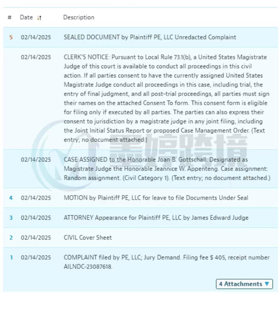 本案于2025年2月14日发起侵权诉讼,案件号:25-cv-01614,原告尚未提起TRO禁令(Temporary Restraining Order,临时限制令)。