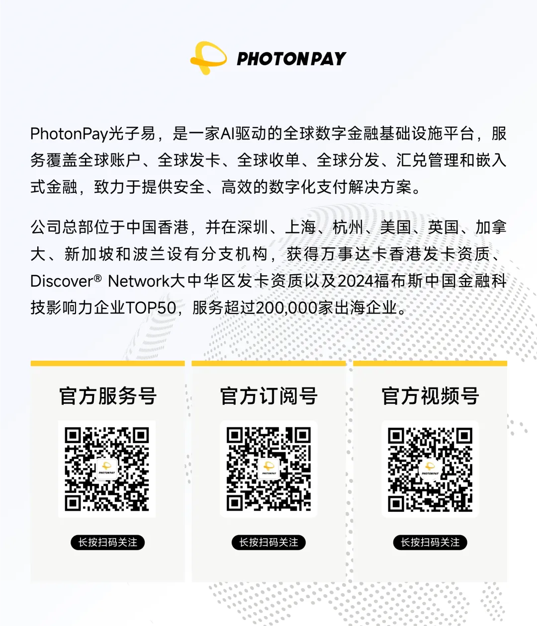 作为一家AI驱动的全球数字金融基础设施平台,PhotonPay光子易将人工智能技术深度融入汇兑管理、风控、反洗钱、客户服务等支付环节,构建起智能化、自动化的全球资金管理体系。