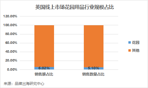 品牌出海研究中心通过线上销售数据分析,得出英国线上花园用品行业的规模情况,其销售额占比整体线上市场的6.02%,线上销售数量占比整体线上市场的5.1%,均价在48英镑左右。