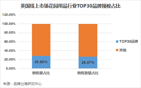 英国线上市场花园用品行业TOP30品牌的销售额占比28.68%,销售数量占比26.87%,TOP30品牌的平均单价低于花园用品行业线上销售平均单价,为26英镑。