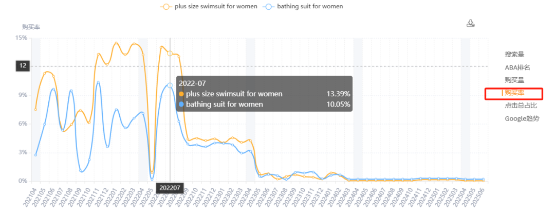 例如“女式泳装”和“大码女式泳衣”购买率占比来看,精准化的大码女装购买率更高: