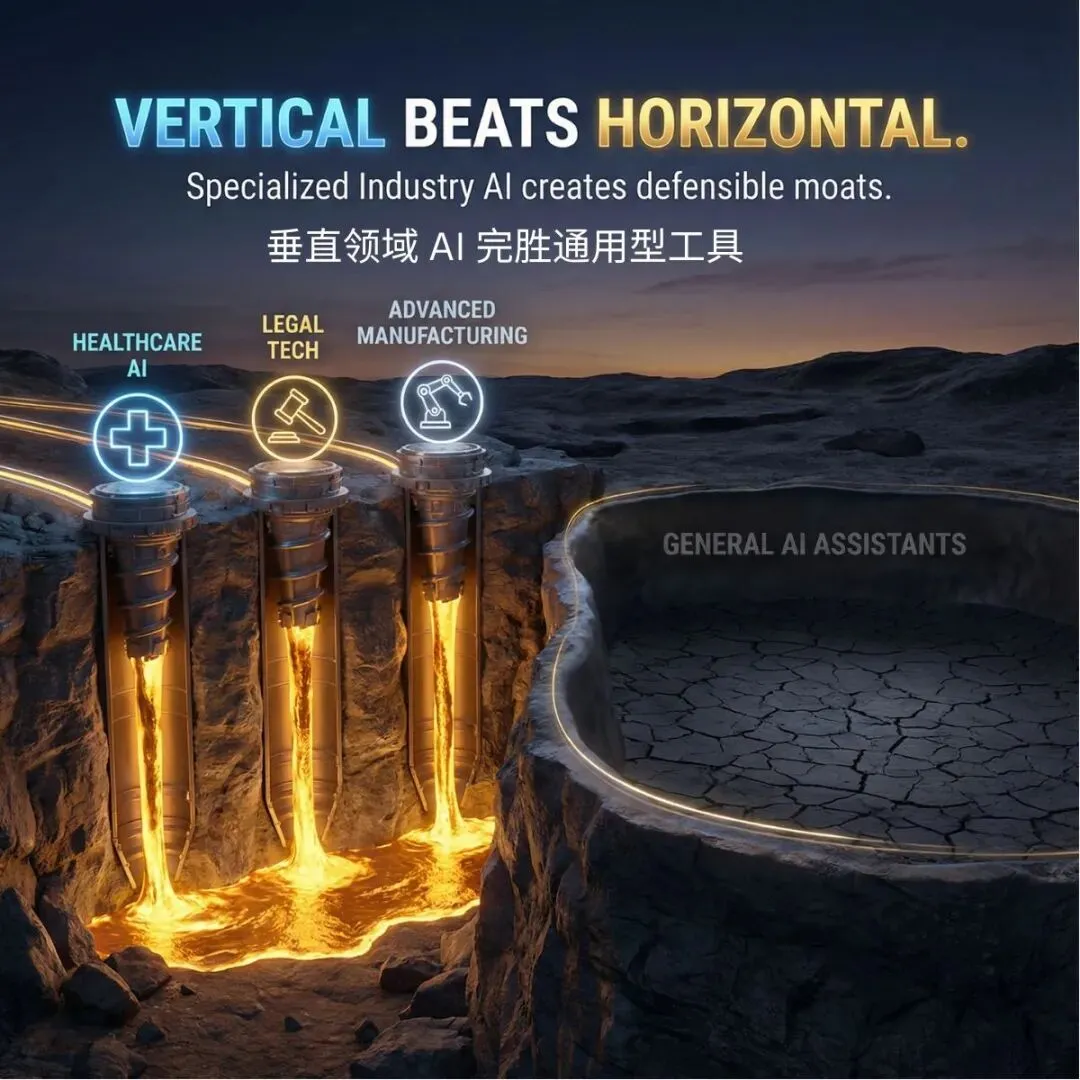 专注法律、医疗、金融等特定行业的 AI 解决方案公司,融资轮次规模远超横向通用平台。法律领域的 Harvey、医疗领域的 Abridge,以及多家金融科技 AI 公司都证明:行业专业知识 + 专有数据,能构筑起难以撼动的竞争优势。