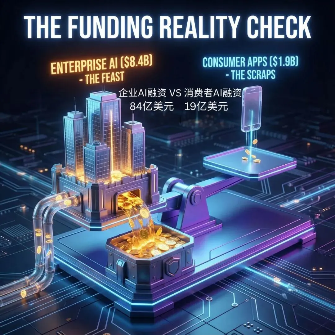 资金分配差距悬殊:B2B AI 工具融资 84 亿美元,消费者 AI 应用仅 19 亿美元,比例超 4:1。投资者可不傻 —— 他们紧盯真实收益与明确的投资回报率指标。虽然企业客户的销售周期可能更长,但交易规模大、客户留存率高,长期价值更稳。