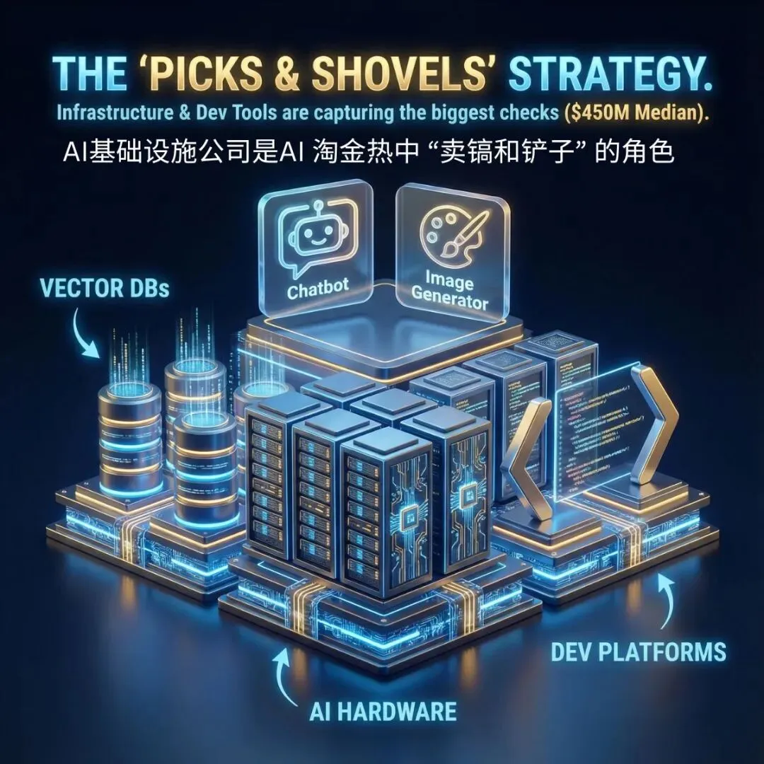 AI 基础设施公司获得的融资占比极高,平均每轮融资超 4 亿美元。核心原因很简单:每一个 AI 应用都离不开底层支持技术。就像 AI 淘金热中 “卖镐和铲子” 的角色,这类公司持续拿下更大融资轮次,增长速度也更快。