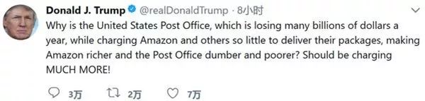 这不是特朗普第一次抨击亚马逊。今年8月16日,特朗普发布推文,斥责亚马逊不收销售税给零售商带来“巨大危害”。