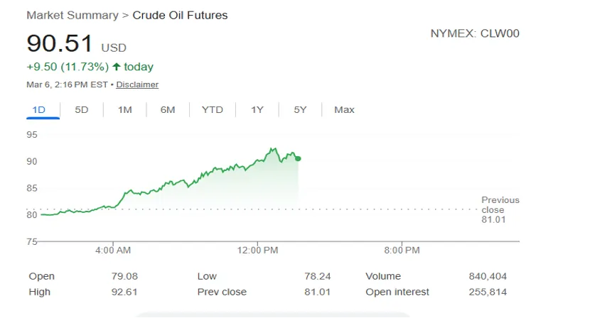 北京时间3月6日晚间,原油市场持续暴涨,纽约原油暴涨约12%,一举突破90美元整数关口!