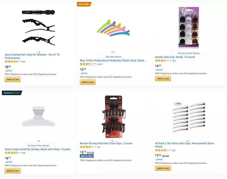 在亚马逊上搜索“hair clips”,Diane Large蝶形发夹拿到了Amazon’s Choice标签,如下图: