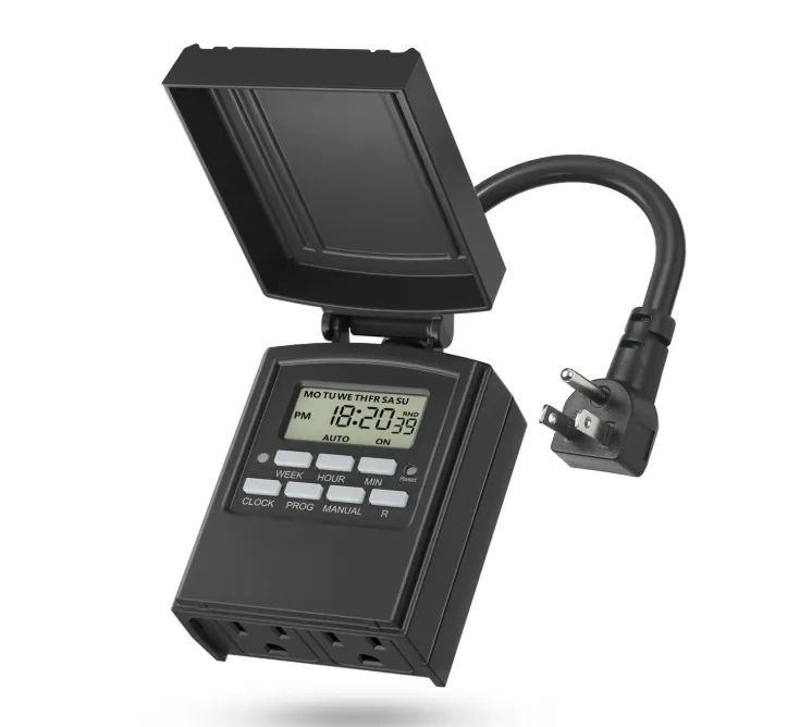 产品描述:这款户外防水定时插座配备两个接地插孔,可设置最多八组开关程序,使用户能够根据每日或每周需求自动控制庭院灯光、节日装饰灯或水景设备。产品支持自定义工作日组合,并可一键切换夏令时间,同时具备“随机模式”,在用户外出时让灯光随机开关,增强居家安全感。外壳具备防风雨保护,可在室外环境中稳定工作,适用电压为 125V,最大负载为 1875W,满足大多数家庭户外照明设备的使用需求。