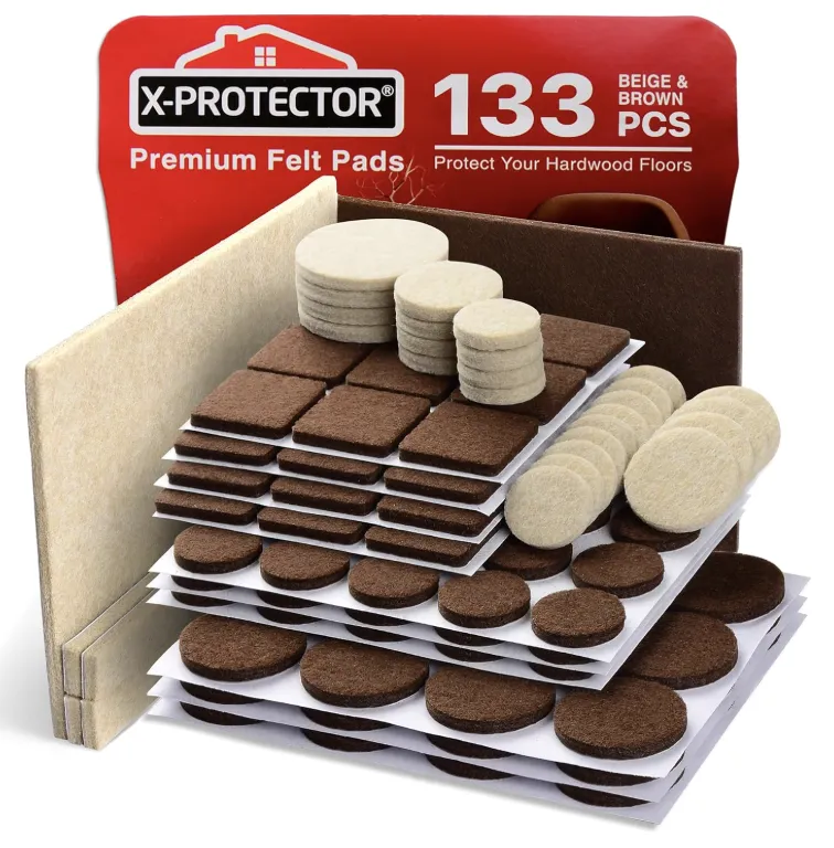产品描述:这款毛毡桌脚垫共包含 133 片防刮垫,提供深色与浅色两种组合,适配深色与浅色家具,可覆盖大多数桌椅脚、矮柜与装饰摆件的底部。套装内含多种尺寸,包括圆形、方形与大面积垫片,用户可根据家具脚部大小自由选择。厚实的毛毡材料可在木地板、瓷砖或复合地板上形成缓冲层,减少划痕与摩擦噪音;背面自粘结构可牢固贴合家具底部,安装方式简单,不需要额外工具。产品适用于椅子、茶几、柜子等多种家具,可满足家庭对地板保护的日常需求。