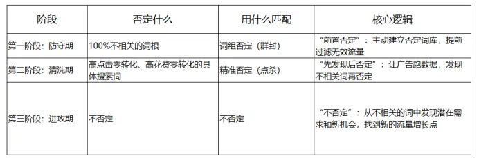 否定关键词的三个阶段,本质上是从“防守”走向“进攻” 的过程: